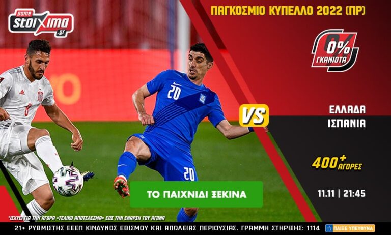 Πλούσιο, λοιπόν, το πρόγραμμα της Πέμπτης (11/11), με την Εθνική μας ομάδα να υποδέχεται την Ισπανία σ’ ένα καθοριστικό παιχνίδι για την πρόκριση στην τελική φάση του Μουντιάλ 2022. Στο ανανεωμένο Pamestoixima.gr το Ελλάδα – Ισπανία το ζεις παραπάνω με 0% γκανιότα** και περισσότερα από 400 ειδικά στοιχήματα στις αποδόσεις που πάντα ήθελες!