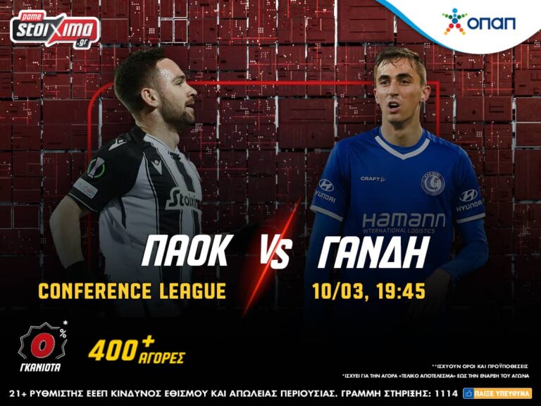 Από εκεί και πέρα, η δράση συνεχίζεται με κομβικές αναμετρήσεις στο Europa League και στο Conference League. Ο ΠΑΟΚ υποδέχεται τη Γάνδη, θέλει να πάρει προβάδισμα πρόκρισης και στο Pamestoixima.gr τη συγκεκριμένη αναμέτρηση τη ζεις με 0% γκανιότα** και περισσότερες από 400 ειδικές αγορές για κάρτες, κόρνερ, παίκτες και όχι μόνο!