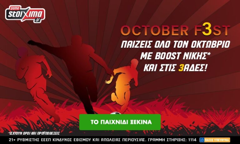 Νέος μήνας, νέα σπουδαία προσφορά* από το Pamestoixima.gr που συνεχίζει να βρίσκεται έμπρακτα δίπλα στους παίκτες του! Μετά το Extreme September, ήρθε η ώρα για το October F3st, με το ποντάρισμά σου να αποκτά μεγαλύτερη αξία ΟΛΟ τον Οκτώβριο στο Pamestoixima.gr. Πιο συγκεκριμένα, για όλο τον μήνα, παίζεις με Boost Νίκης* και στις 3άδες, συνεπώς τα κέρδη σου πολλαπλασιάζονται! Μην χάσεις την ευκαιρία!