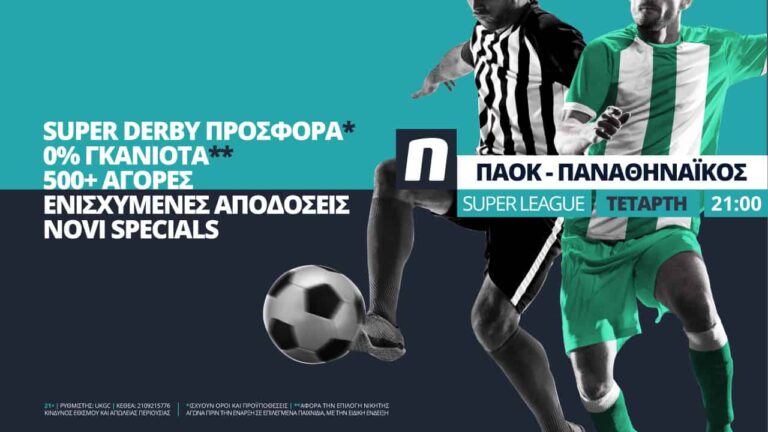 Πλήθος αγορών υπάρχει διαθέσιμο για το ΠΑΟΚ – Παναθηναϊκός. Novi Specials, ενισχυμένες αποδόσεις, 500+ αγορές & μια σούπερ προσφορά* για το μεγάλο παιχνίδι.